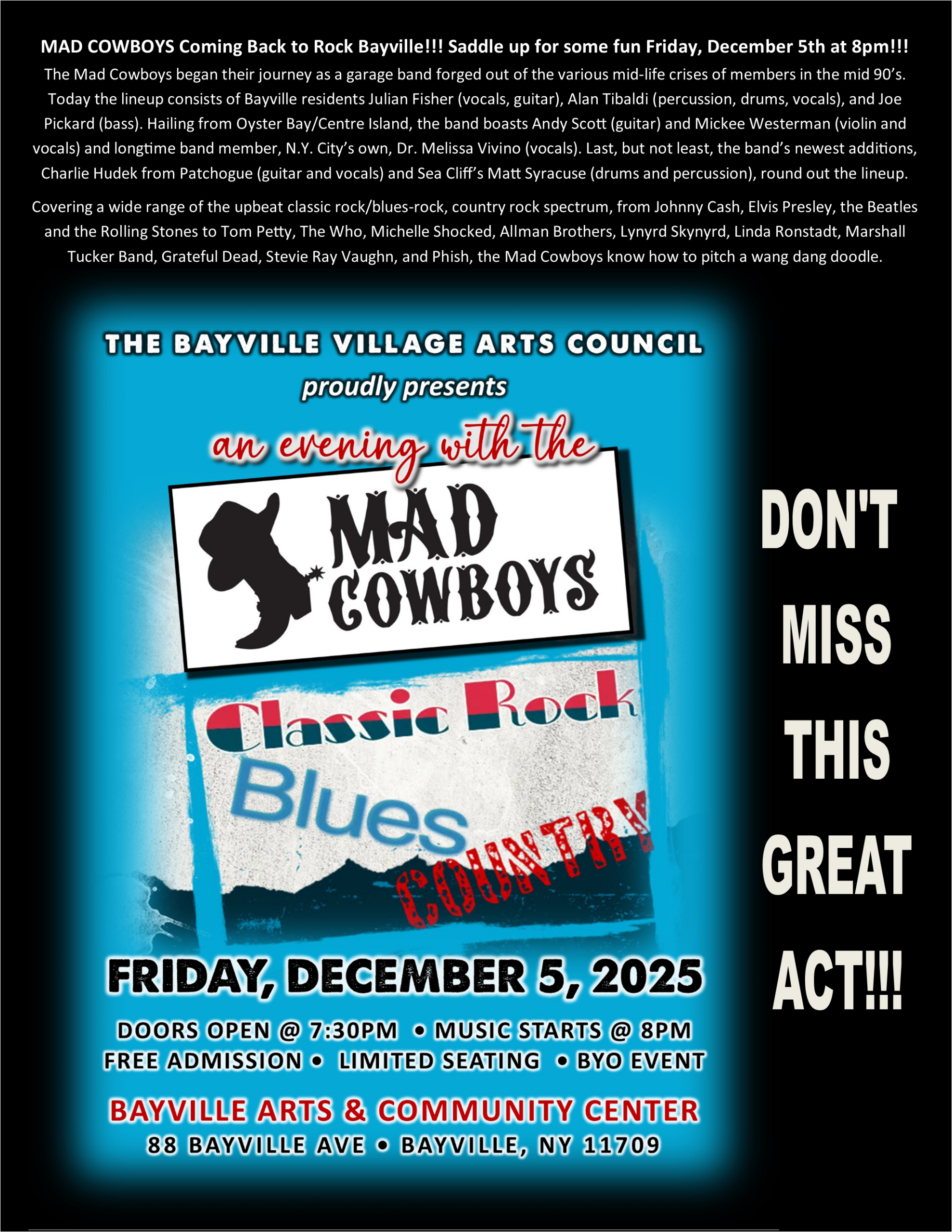 MAD COWBOYS RETURN to rock Bayville Fri, December 5, 8pm, at Bayville Arts Center